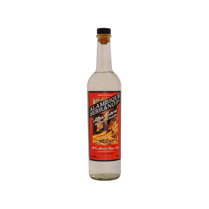 Alambique Serrano Altos Esteres stands apart as one of the few pot-distilled rums made entirely from organic Java varietal sugarcane grown at altitudes reaching 4,000 feet in Oaxaca's steep hillsides, where an extended 25-day fermentation in pine tanks with ambient yeast creates intensely aromatic high-ester compounds that deliver explosive tropical fruit and funky character at a robust 63.9% ABV—all without any added water or sugar diluting its raw, terroir-driven personality.