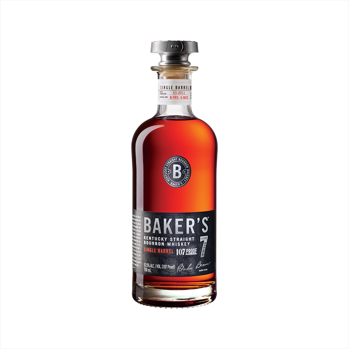 Baker's 7 Year Old Single Barrel Bourbon stands out for its intense, full-bodied flavor profile that comes from being aged in the upper floors of the rickhouse, where temperature fluctuations are more extreme. This small-batch bourbon, bottled at a robust 107 proof, offers a rich complexity with notes of toasted nuts and vanilla, making it an excellent choice for sipping neat or as the foundation for bold cocktails.